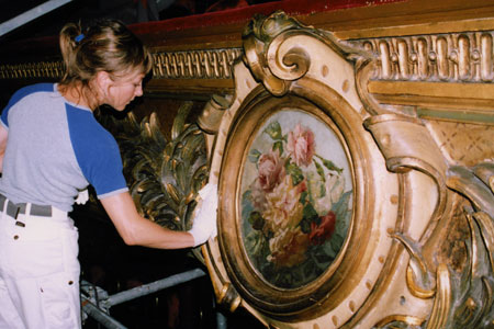 Restauratie en reconstructie van ‘carton-pierre’ en ‘dorure à l’effet’ in de spektakelzaal van de Koninklijke Muntschouwburg te Brussel, België.