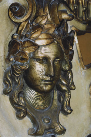 Restauratie en reconstructie van ‘carton-pierre’ en ‘dorure à l’effet’ in de spektakelzaal van de Koninklijke Muntschouwburg te Brussel, België. Gemengde technieken met acrylverf, olieverf, Paraloid, schellak en microkristallijne was.